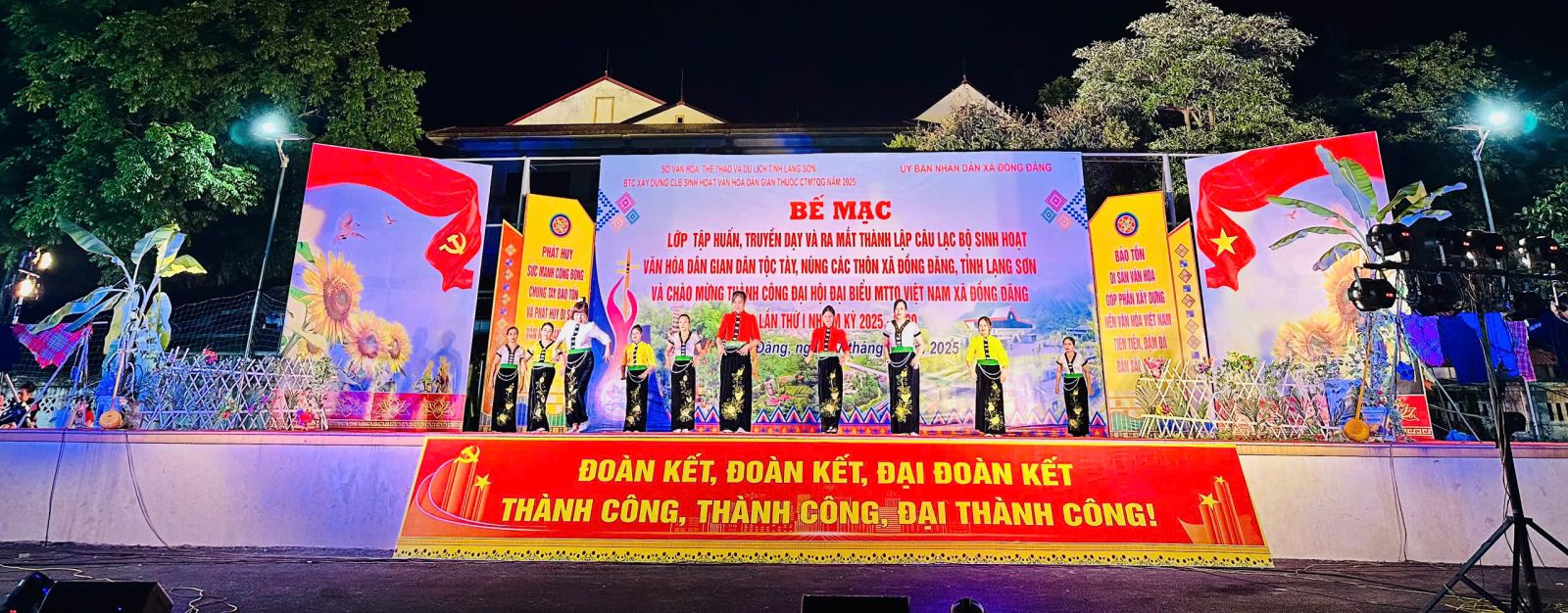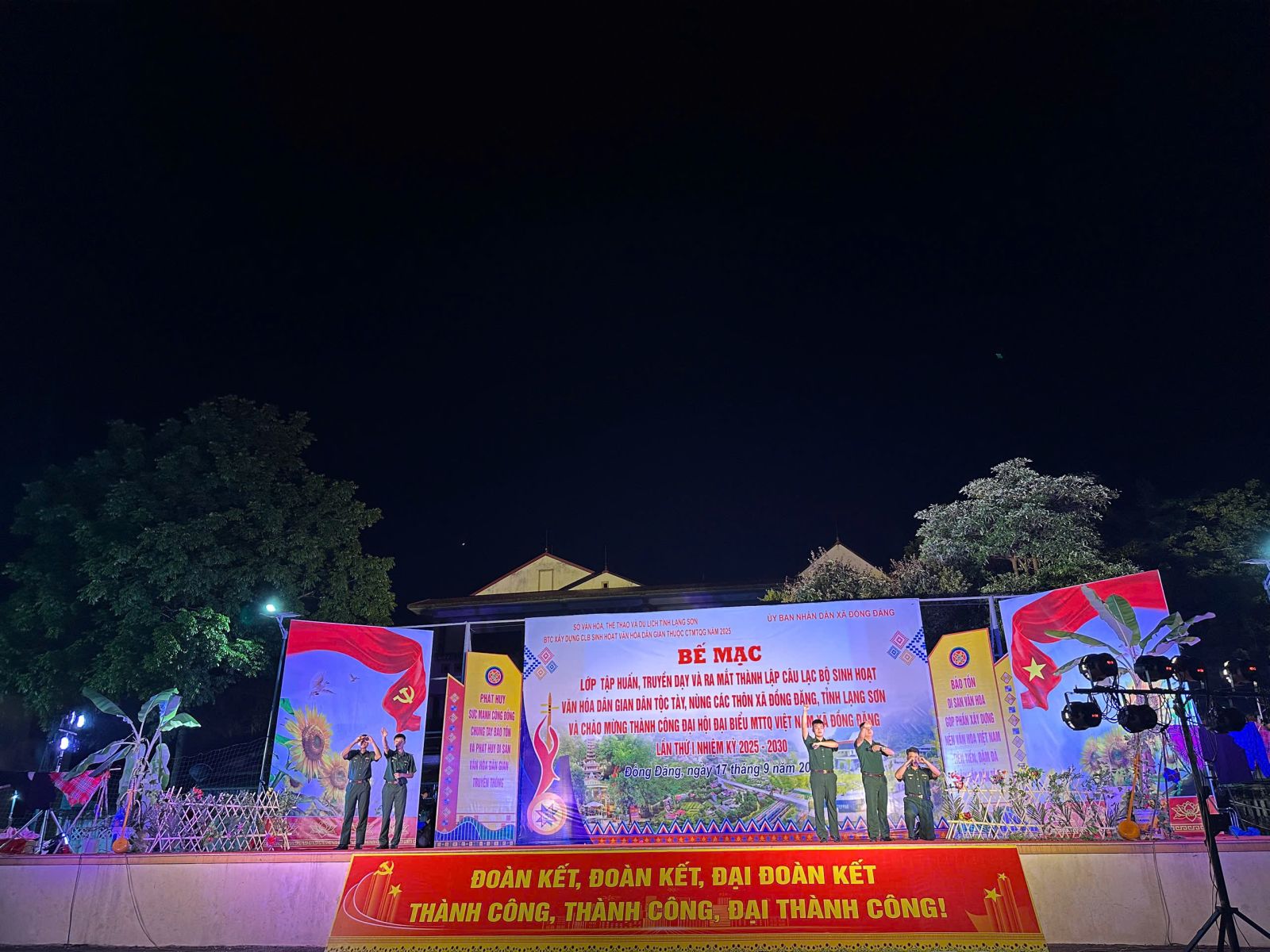 Tối ngày 17/9/2025, tại sân khấu trung tâm xã Đồng Đăng, UBND xã phối hợp với Sở Văn hoá Thể thao và Du lịch tỉnh Lạng Sơn đã tổ chức Lễ bế mạc lớp tập huấn, truyền dạy và ra mắt thành lập Câu lạc bộ sinh hoạt văn hóa dân gian các thôn trên địa bàn xã. Đây là hoạt động thiết thực nhằm bảo tồn và phát huy các giá trị văn hóa truyền thống, đồng thời chào mừng thành công Đại hội MTTQ Việt Nam xã Đồng Đăng lần thứ I, nhiệm kỳ 2025-2030.