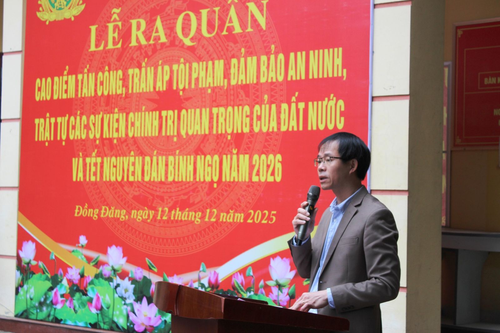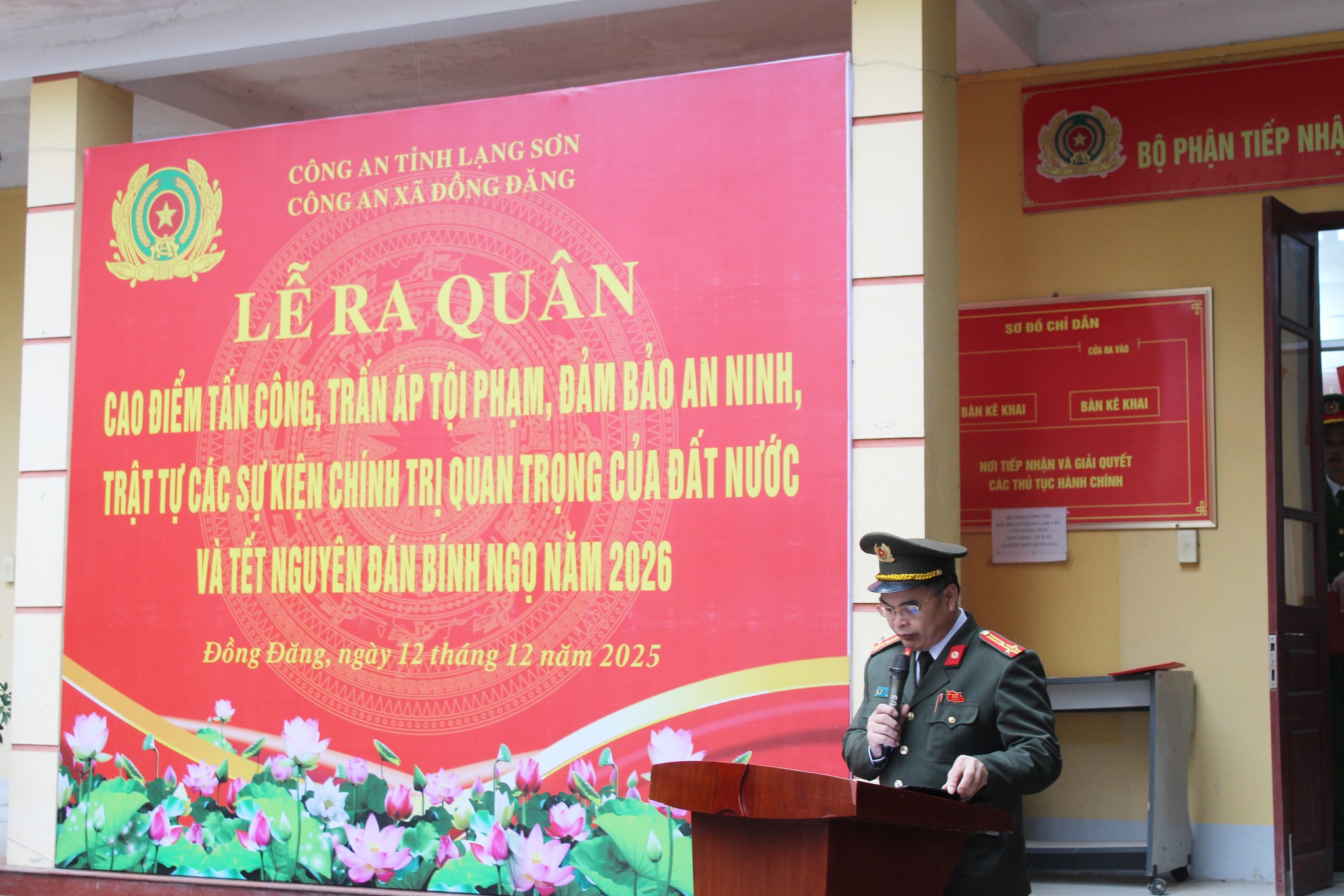 Sáng ngày 12/12/2025, Công an xã Đồng Đăng tổ chức Lễ ra quân đợt cao điểm tấn công, trấn áp tội phạm, bảo đảm an ninh trật tự trên địa bàn xã trong dịp cuối năm và Tết Nguyên đán sắp tới. Buổi lễ diễn ra trong không khí nghiêm túc, trang trọng, thể hiện quyết tâm chính trị cao của cấp ủy, chính quyền và các lực lượng chức năng trong công tác giữ gìn an ninh trật tự, vì cuộc sống bình yên của Nhân dân.