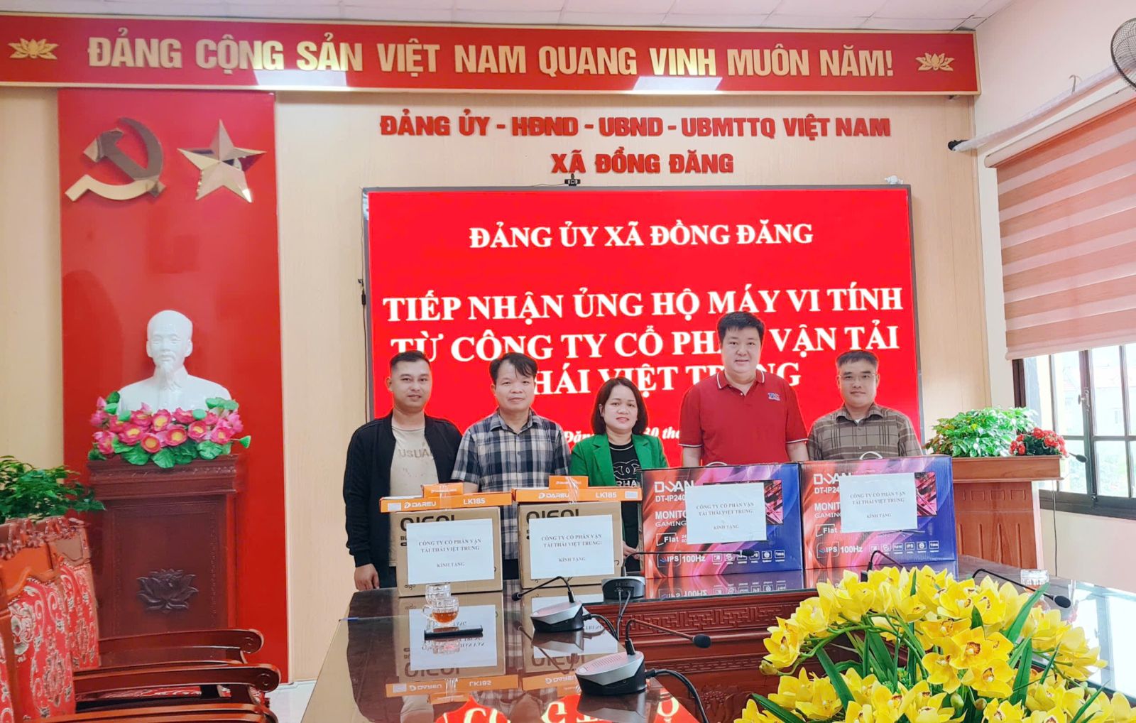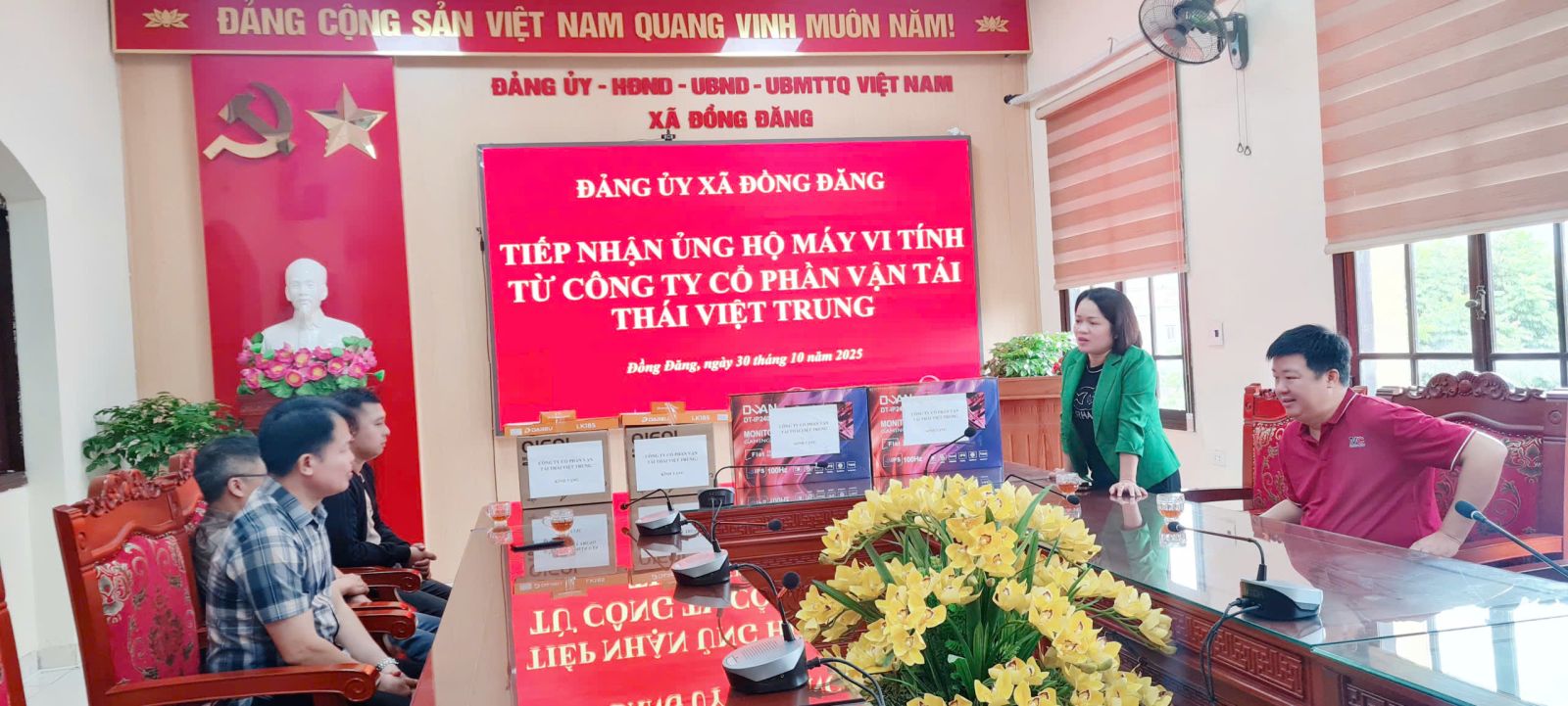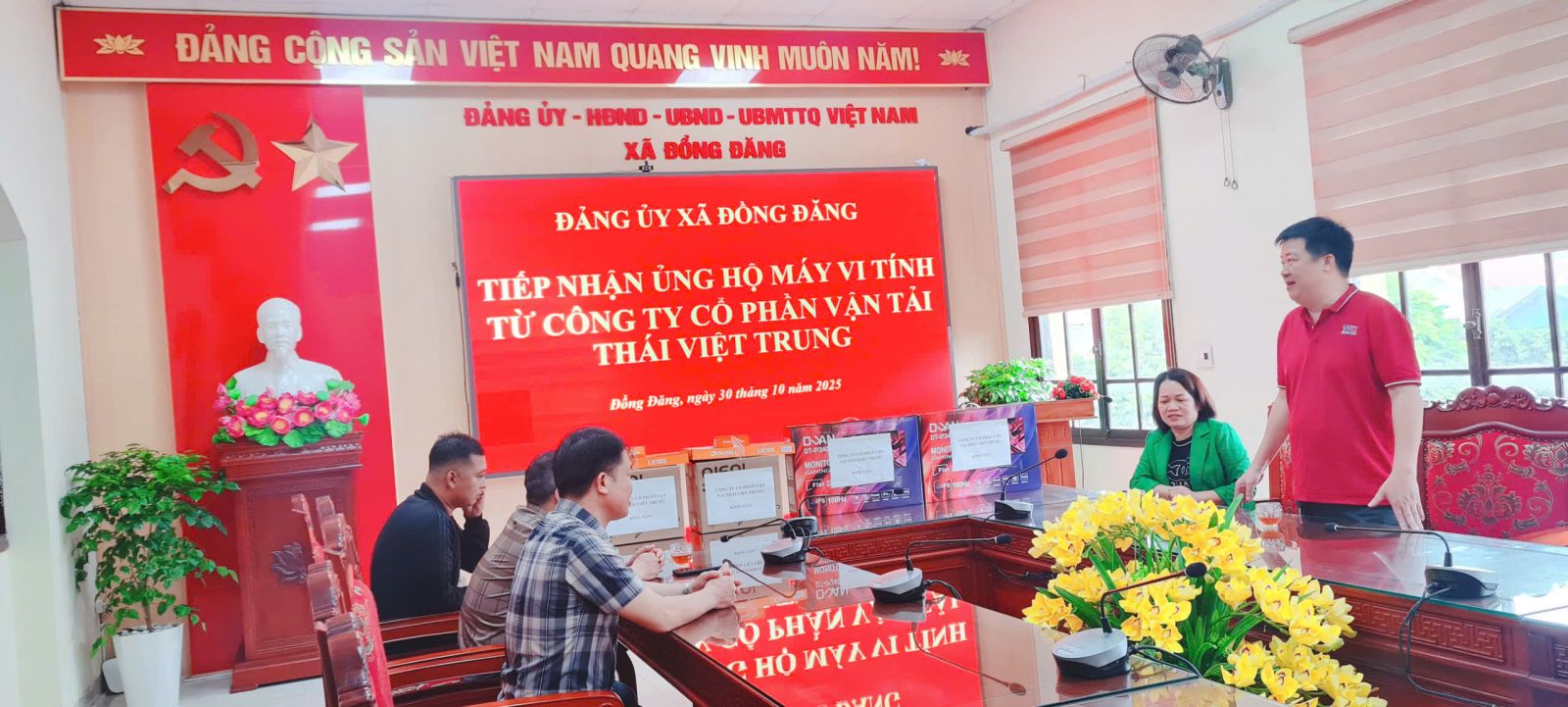 Hưởng ứng phong trào “Vận động ủng hộ máy vi tính và kinh phí phục vụ trang bị máy tính cho các thôn trên địa bàn xã Đồng Đăng” do Ban Thường vụ Đảng ủy xã Đồng Đăng phát động, sáng ngày 30/10/2025, ông Nguyễn Văn Tùng – Phó Giám đốc Công ty Cổ phần Vận tải Thái Việt Trung đã trực tiếp trao tặng 02 bộ máy vi tính trị giá hơn 16.000.000 đồng cho xã Đồng Đăng.