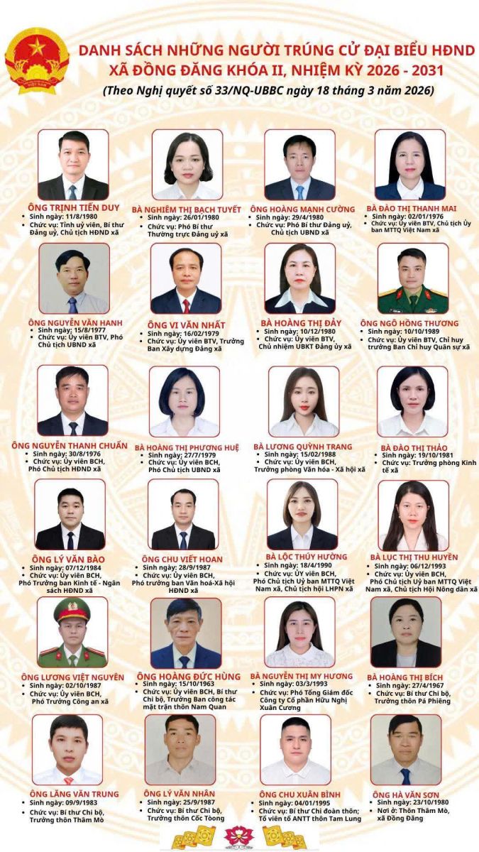 Danh sách trúng cử đại biểu HĐND xã Đồng Đăng khoá II, nhiệm kỳ 2026-20231