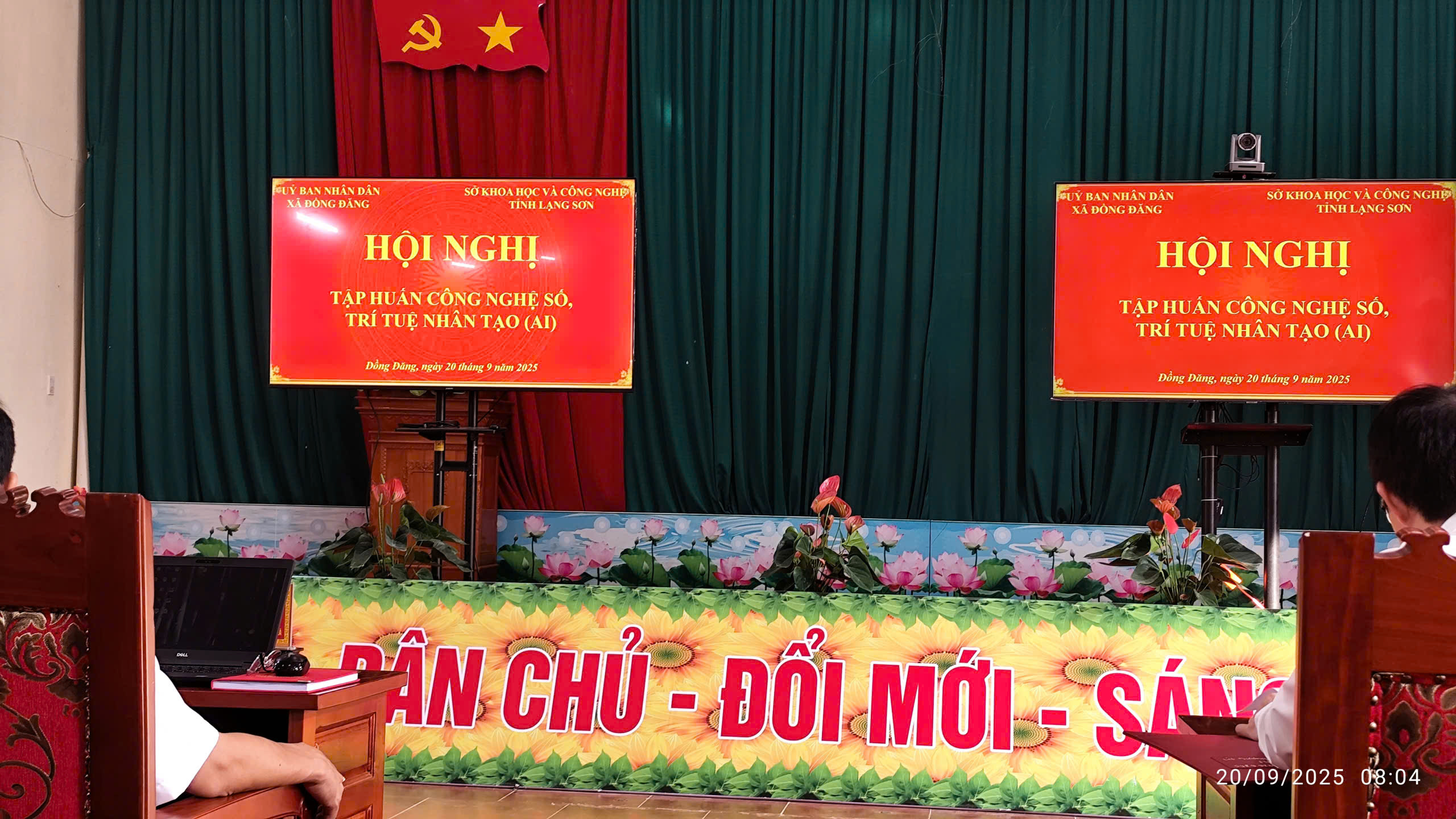 Thực hiện Kế hoạch số 42/KH-UBND ngày 28/8/2025 của UBND xã Đồng Đăng về triển khai phong trào Bình dân học vụ số trên địa bàn xã Đồng Đăng . Ngày 20/9/2025, UBND xã Đồng Đăng phối hợp với Sở Khoa học và Công nghệ tỉnh Lạng Sơn tổ chức Hội nghị tập huấn “Ứng dụng công nghệ số và trí tuệ nhân tạo AI trong quản lý, điều hành và phát triển kinh tế - xã hội” cho đội ngũ cán bộ, công chức xã.