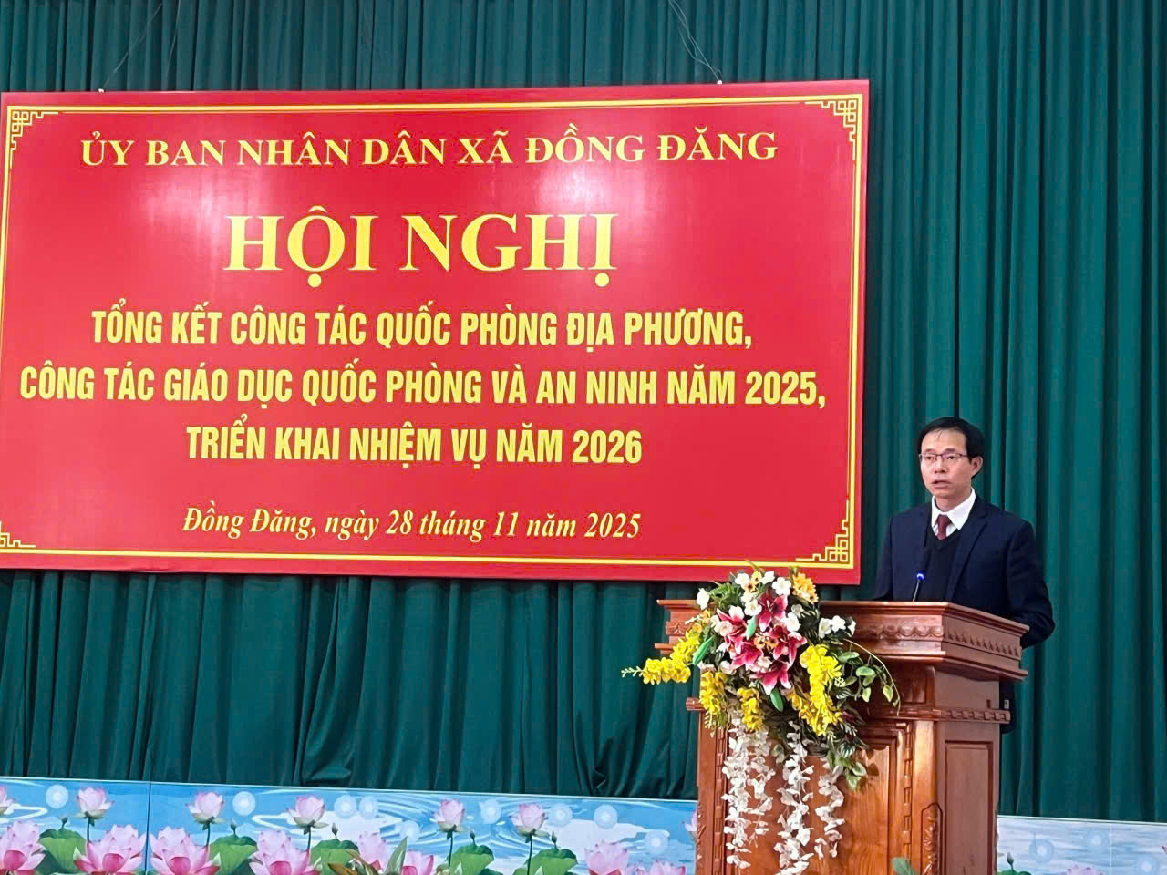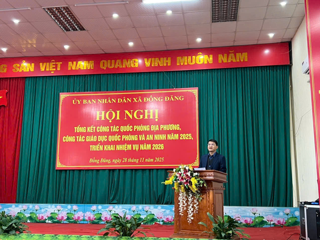 Chiều 28/11/2025, UBND xã Đồng Đăng tổ chức Hội nghị tổng kết nhiệm vụ quân sự – quốc phòng năm 2025 và triển khai phương hướng nhiệm vụ trọng tâm năm 2026. Tham dự hội nghị có đồng chí Trung tá Vi Anh Tuấn - Phó Chỉ huy trưởng BCH PTKV 3 - Nhân Lý ; Về lãnh đạo địa phương có đồng chí Trịnh Tiến Duy - Tỉnh Uỷ viên, Bí Thư Đảng ủy xã ; đồng chí Hoàng Mạnh Cường - Chủ tịch UBND xa; đồng chí Hứa Văn Tuấn - CHT Ban CHQS xã. Đồn Biên phòng CKQT Hữu nghị, Đồn Biên phòng Bảo Lâm, Kiểm lâm phụ trách quản lý địa bàn, Chi cục Hải quan CKQT Hữu Nghị, Đại diện lãnh đạo các trường học trên địa bàn xã Đồng Đăng. Cùng các đồng chí Ủy viên Ban Thường vụ Đảng ủy xã, lãnh đạo MTTQ và các tổ chức chính trị xã hội, Công an, Bí thư chi bộ, trưởng ban điều hành, thôn đội trưởng các khu phố và đông đảo lực lượng dân quân xã. Tại hội nghị, đại biểu đã nghe báo kết quả thực hiện nhiệm vụ quân sự – quốc phòng năm 2025 và triển khai phương hướng trọng tâm năm 2026, qua đó nhìn lại những kết quả nổi bật trong công tác sẵn sàng chiến đấu, xây dựng lực lượng dân quân, tuyển chọn và gọi công dân nhập ngũ, công tác hậu cần – kỹ thuật. Qua đó, trong năm 2025, Ban CHQS xã đã thực hiện hiệu quả công tác tham mưu Đảng ủy, UBND xã về thực hiện nhiệm vụ quân sự – quốc phòng; duy trì nghiêm chế độ trực sẵn sàng chiến đấu, phối hợp tuần tra giữ vững an ninh trật tự; hoàn thành chỉ tiêu tuyển chọn và gọi công dân nhập ngũ; xây dựng lực lượng dân quân đạt theo quy định. Công tác huấn luyện, hội thi – hội thao được triển khai đúng kế hoạch; công tác giáo dục quốc phòng và an ninh có nhiều đổi mới; bảo đảm hậu cần – kỹ thuật đầy đủ cho các nhiệm vụ. Đời sống cán bộ, chiến sĩ được chăm lo, các chế độ chính sách được thực hiện kịp thời, góp phần nâng cao chất lượng tổng hợp và sức mạnh chiến đấu của lực lượng dân quân xã trong tình hình mới. Hội nghị cũng đã thông qua kế hoạch thực hiện nhiệm vụ quân sự - quốc phòng năm 2026.