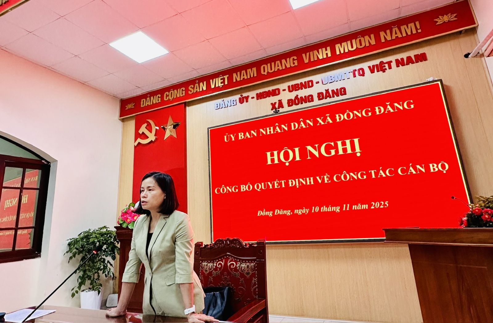 Tại hội nghị, đại diện Văn phòng HĐND&UBND xã đã công bố Quyết định của Chủ tịch UBND xã về việc tiếp nhận và bổ nhiệm đồng chí Hoàng Thị Nhung, Phó Hiệu trưởng Trường Mầm non Hòa Cư (xã Công Sơn), đến công tác và giữ chức vụ Hiệu trưởng Trường Mầm non Bảo Lâm (xã Đồng Đăng). Quyết định có hiệu lực kể từ ngày 10/11/2025, thời hạn giữ chức vụ là 5 năm.