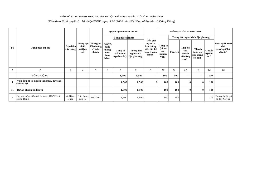 | Tiêu đề văn bản | Nghị quyết về việc bổ sung danh mục dự án thuộc kế hoạch đầu tư công năm 2026 (Dự án chuẩn bị đầu tư) | ||