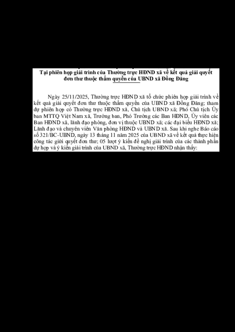 | Tiêu đề văn bản | Trích yếu THÔNG BÁO KẾT LUẬN CỦA CHỦ TỊCH HỘI ĐỒNG NHÂN DÂN XÃ Tại phiên họp giải trình của Thường trực HĐND xã về kết quả giải quyết đơn thư thuộc thẩm quyền của UBND xã Đồng Đăng | ||